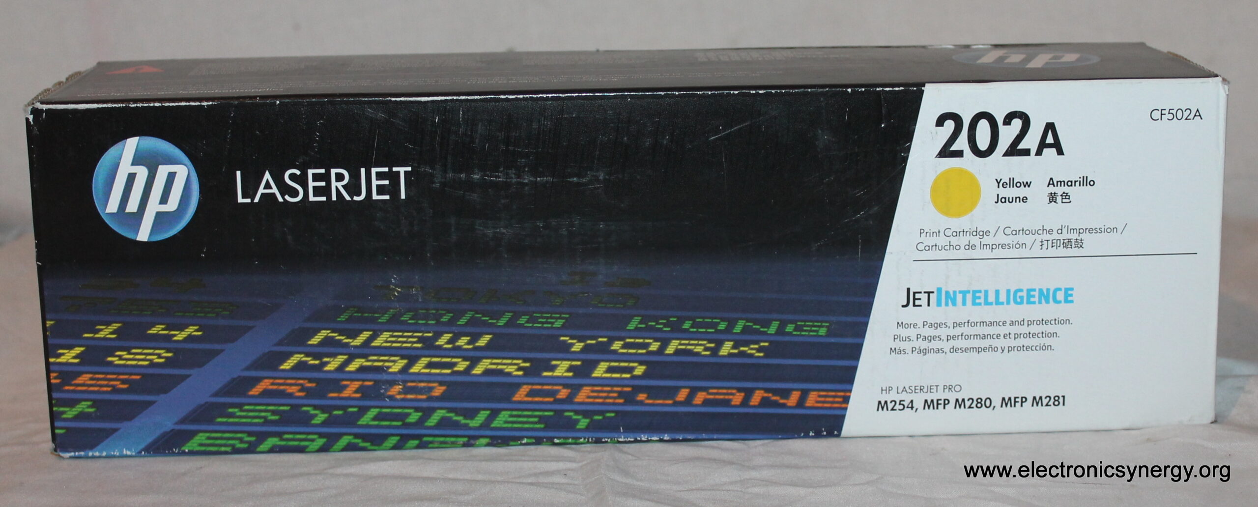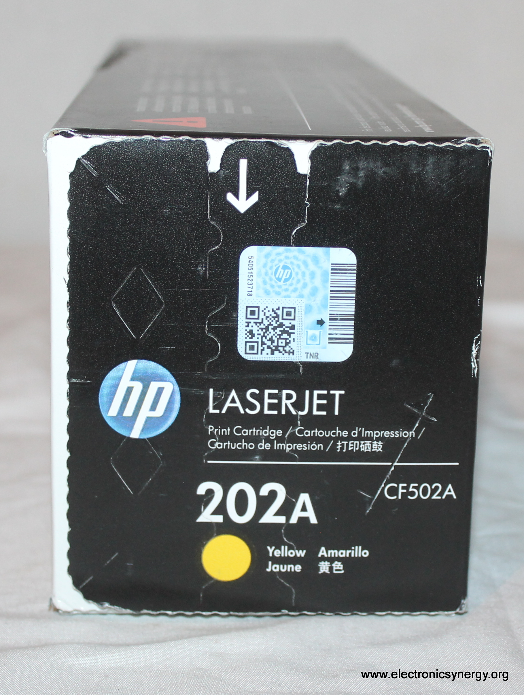 Genuine HP 202A Yellow Toner Cartridge (CF502A). This is new old stock—unused and factory-sealed, though the outer packaging may show minor shelf wear. Delivers vibrant, reliable color prints for compatible HP Color LaserJet printers.